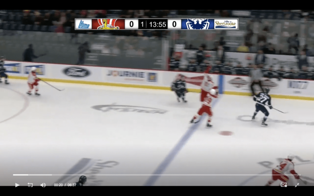 Par exemple, sur l’image qui suit, on aperçoit ce qui a mené au premier but. Le défenseur du Phoenix, à l’extrême gauche, vient d’effectuer une passe lobée en sortie de territoire. Deux joueurs du Drakkar tentent d’attraper la rondelle au vol; Maël Lavigne avec son bâton et Alexis Bernier de la main. Celle-ci tombe finalement derrière eux, directement sur l’attaquant du Phoenix (#27). Ceci provoque donc un surnombre à 3 contre 1, que les joueurs du Phoenix ont parfaitement exécuté, ne laissant aucune chance à Zachary Lessard et Olivier Ciarlo.